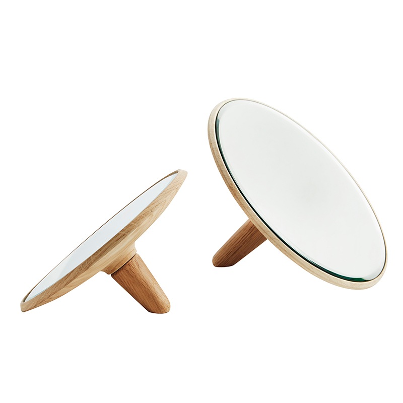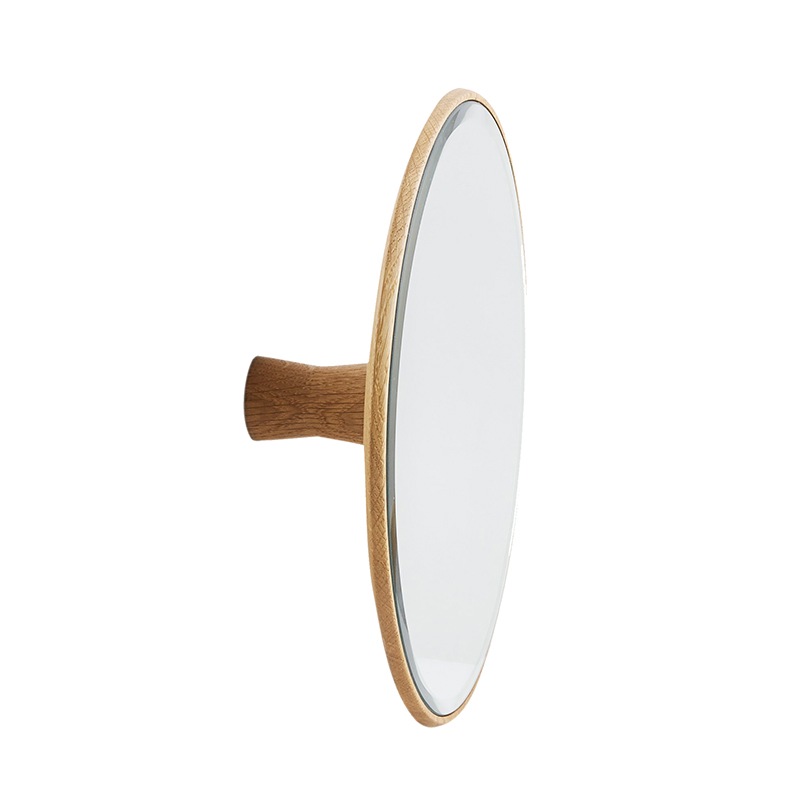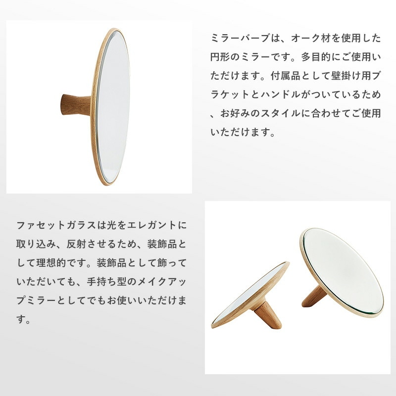 ミラーバーブは、オーク材を使用した円形のミラーです。多目的にご使用いただけます。付属品として壁掛け用ブラケットとハンドルがついているため、お好みのスタイルに合わせてご使用いただけます。ファセットガラスは光をエレガントに取り込み、反射させるため、装飾品として理想的です。装飾品として飾っていただいても、手持ち型のメイクアップミラーとしてでもお使いいただけます。
