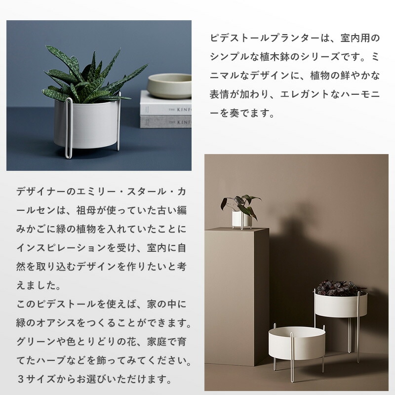 ピデストールプランターは、室内用のシンプルな植木鉢のシリーズです。ミニマルなデザインに、植物の鮮やかな表情が加わり、エレガントなハーモニーを奏でます。デザイナーのエミリー・スタール・カールセンは、祖母が使っていた古い編みかごに緑の植物を入れていたことにインスピレーションを受け、室内に自然を取り込むデザインを作りたいと考えました。このピデストールを使えば、家の中に緑のオアシスをつくることができます。グリーンや色とりどりの花、家庭で育てたハーブなどを飾ってみてください。3サイズからお選びいただけます。