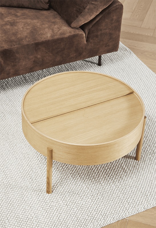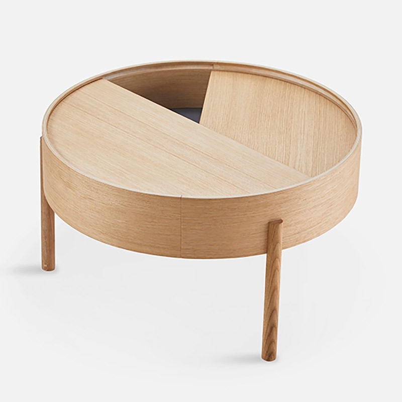 「アーク」は、円の中の 2 つの点を結合する曲線の数学的概念を由来としています。アークテーブルはとてもシンプルな機能からなり、1 本の指で上の卓上を回すことができます。円形の蓋の半分を回転させるだけで、テーブルの表現は変化し続けます。内側の収納スペースのミュートダークグレーの表面は木材を補完するために選択され、3本足の構造は幾何学的な形のデザインに遊び心と軽いタッチを加えます。