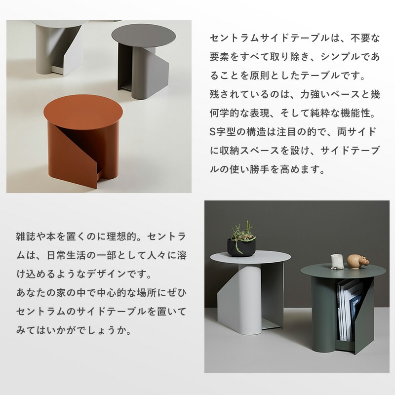 セントラムサイドテーブルは、不要な要素をすべて取り除き、シンプルであることを原則としたテーブルです。残されているのは、力強いベースと幾何学的な表現、そして純粋な機能性。S字型の構造は注目の的で、両サイドに収納スペースを設け、サイドテーブルの使い勝手を高めます。雑誌や本を置くのに理想的。セントラムは、日常生活の一部として人々に溶け込めるようなデザインです。あなたの家の中で中心的な場所にぜひセントラムのサイドテーブルを置いてみてはいかがでしょうか。