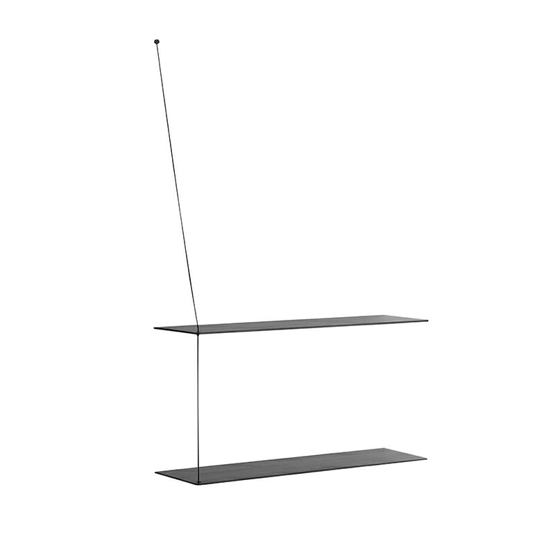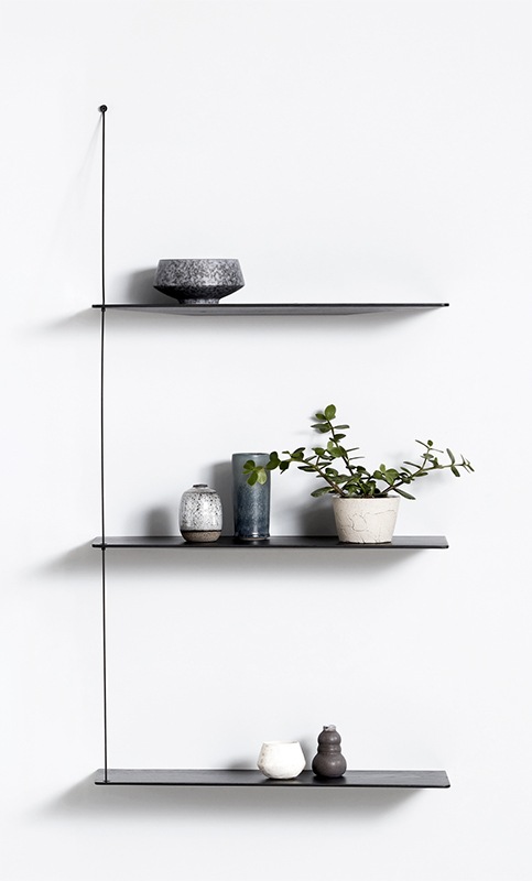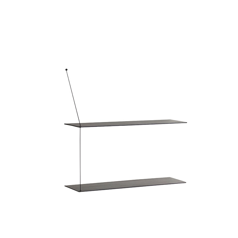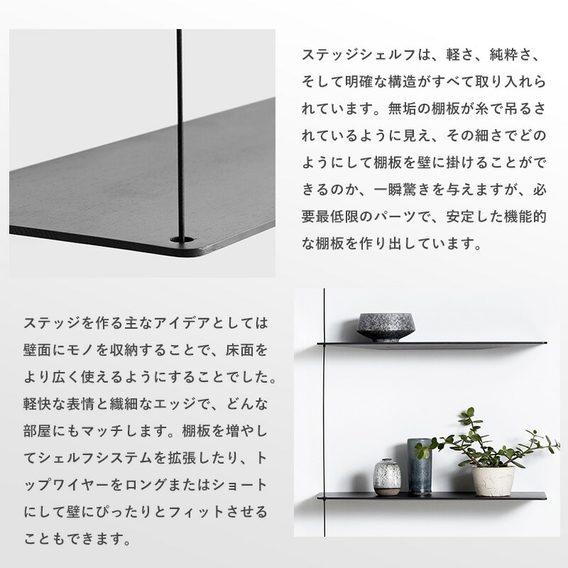 ステッジシェルフは、軽さ、純粋さ、そして明確な構造がすべて取り入れられています。無垢の棚板が糸で吊るされているように見え、その細さでどのようにして棚板を壁に掛けることができるのか、一瞬驚きを与えますが、必要最低限のパーツで、安定した機能的な棚板を作り出しています。ステッジを作る主なアイデアとしては、壁面にモノを収納することで、床面をより広く使えるようにすることでした。軽快な表情と繊細なエッジで、どんな部屋にもマッチします。棚板を増やしてシェルフシステムを拡張したり、トップワイヤーをロングまたはショートにして壁にぴったりとフィットさせることもできます。