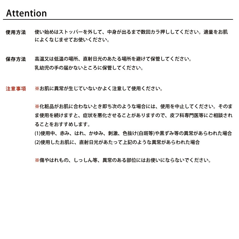 | 使用方法 | 使い始めはストッパーを外して、中身が出るまで数回カラ押ししてください。適量をお肌によくなじませてお使いください。 |