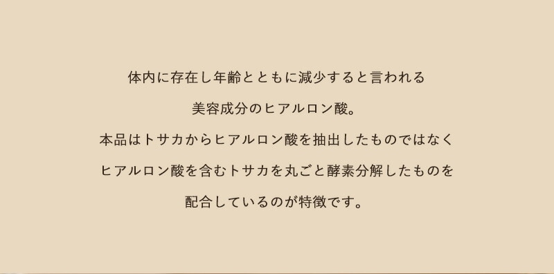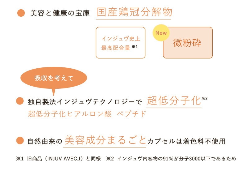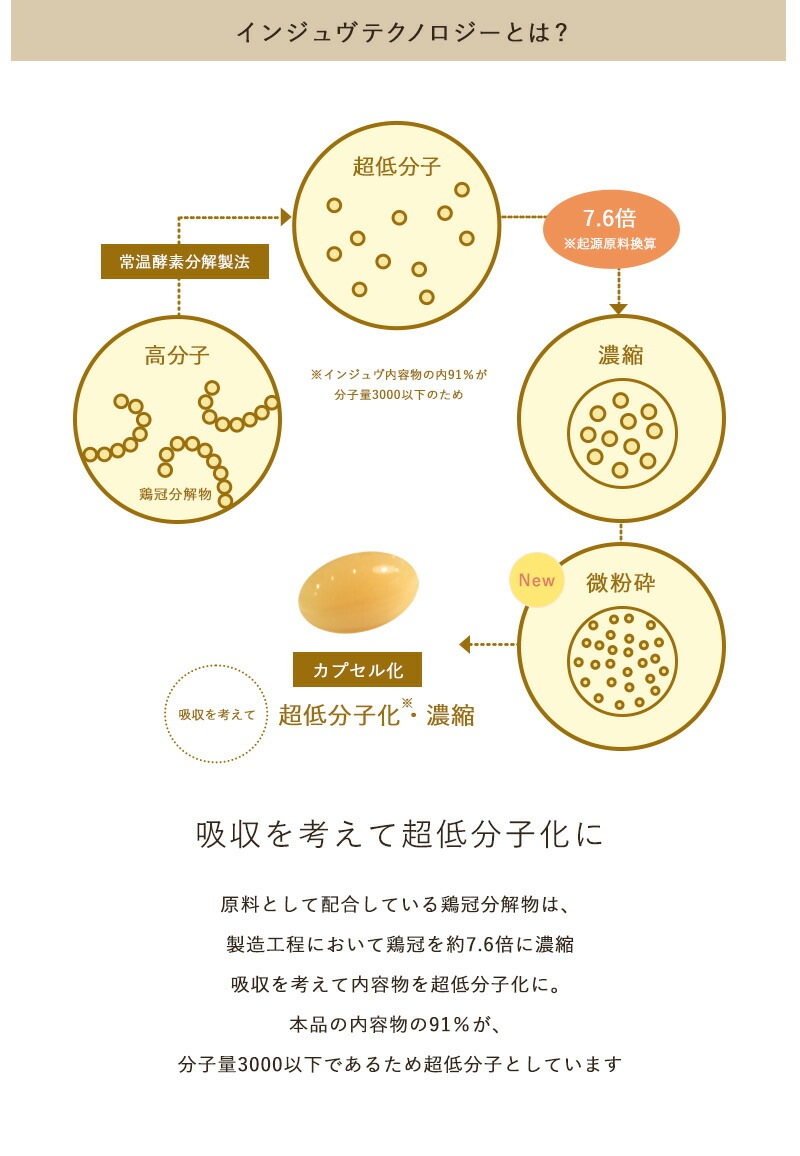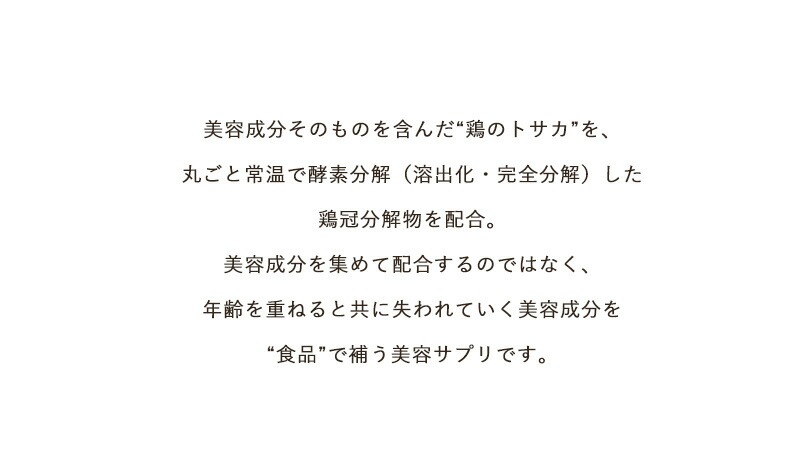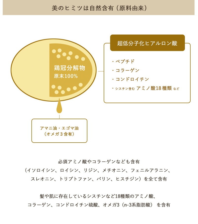 | 鶏冠分解物(国内製造)、亜麻仁油(国内製造)、エゴマ油、ゼラチン、グリセリン、ミツロウ、グリセリン脂肪酸エステル、植物レシチン(大豆由来) |