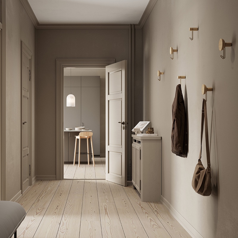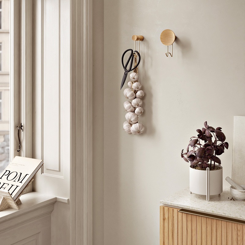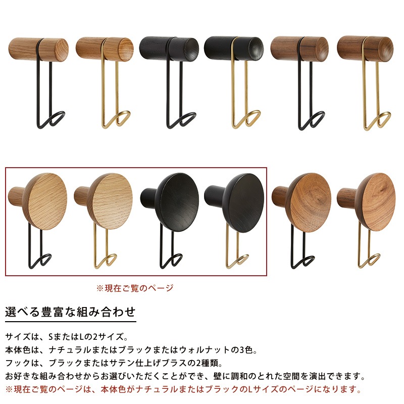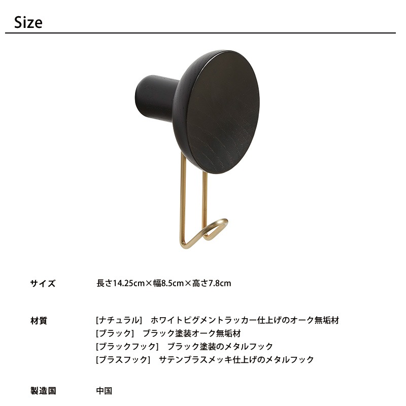 ・材質:[ナチュラル]ホワイトピグメントラッカー仕上げのオーク無垢材、[ブラック]ブラック塗装オーク無垢材、[ブラックフック]ブラック塗装のメタルフック、[ブラスフック]サテンブラスメッキ仕上げのメタルフック